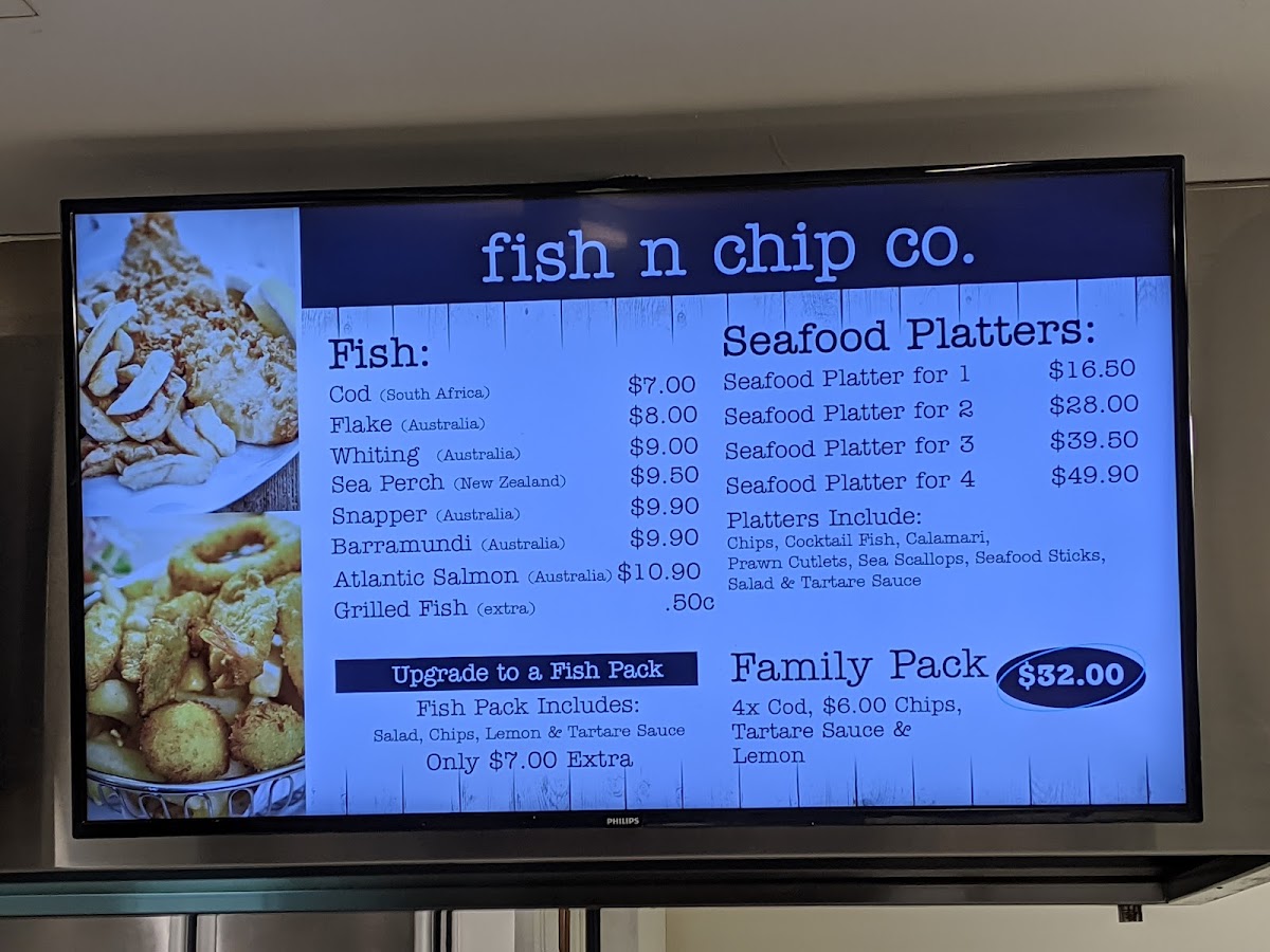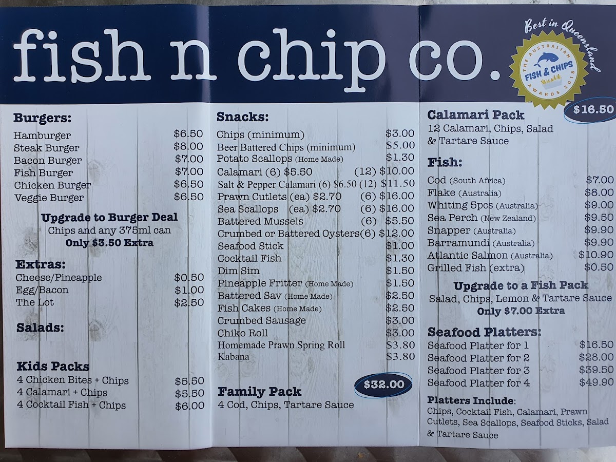 Includes four fish pieces, four calamari, one prawn cutlet, one sea scallop, one seafood stick, chips and a choice of sauce.